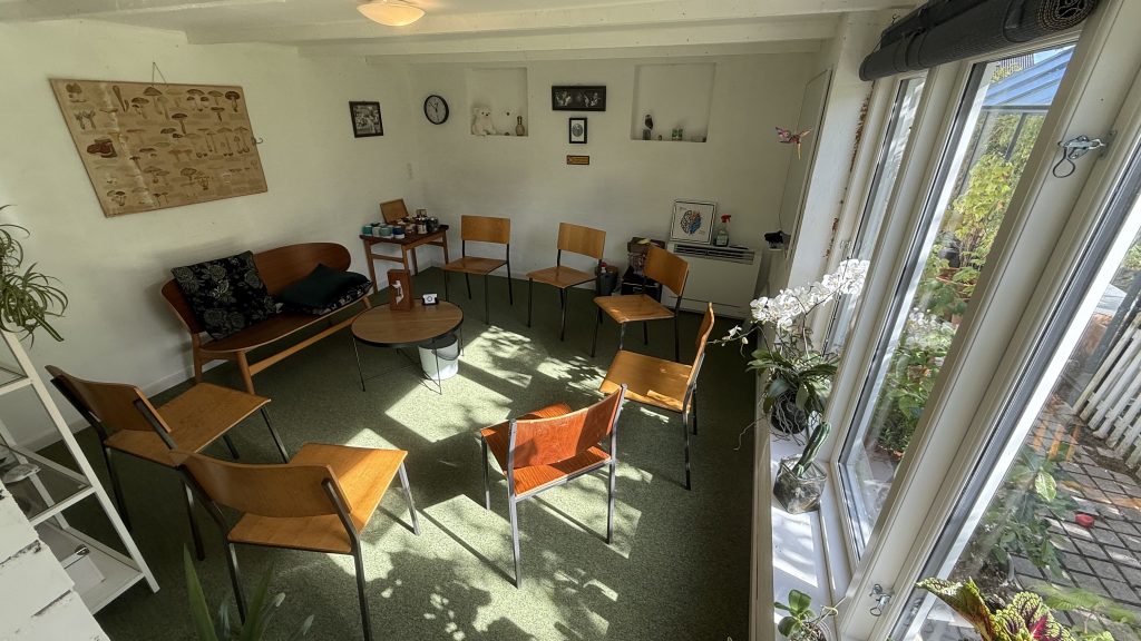 Der er måske ikke meget plads – men der er lys og varme. Det har desuden været gensynsglæde for mange af mine klienter at se stolene fra 70’erne og 80’erne som kan stables – vi er mange der har siddet på dem i folkeskolen. Selv blev jeg ret nostalgisk da jeg fandt dem brugt.